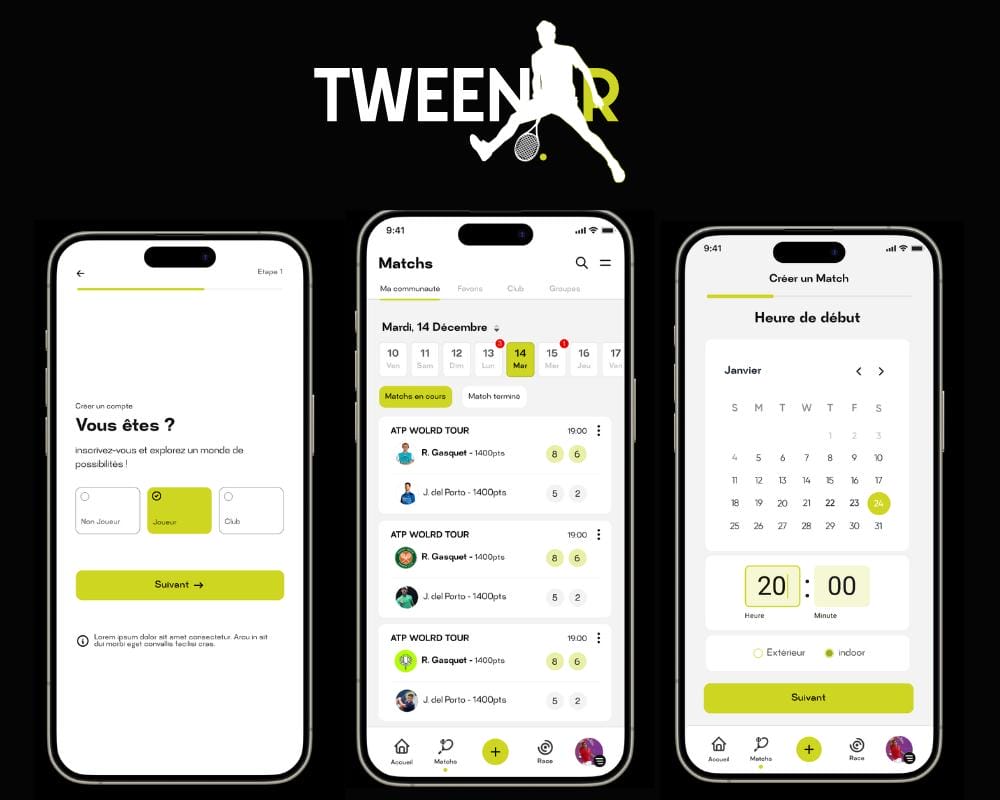 Lionel et Aurélie avaient une vision ambitieuse : transformer le secteur du tennis avec leur application révolutionnaire, Tweenr. Nous avons créé le logo ainsi que la maquette de l’application pour le moment.