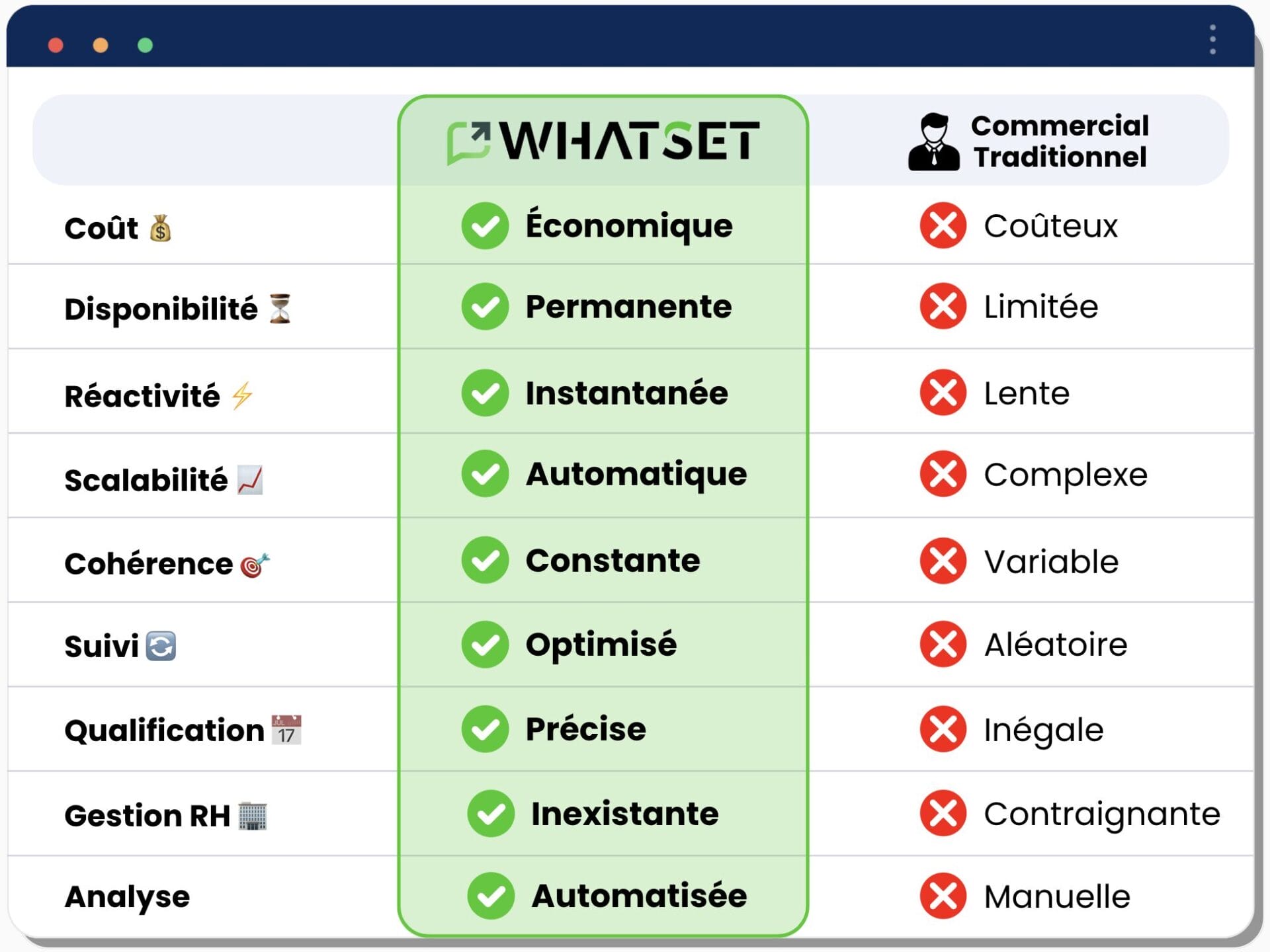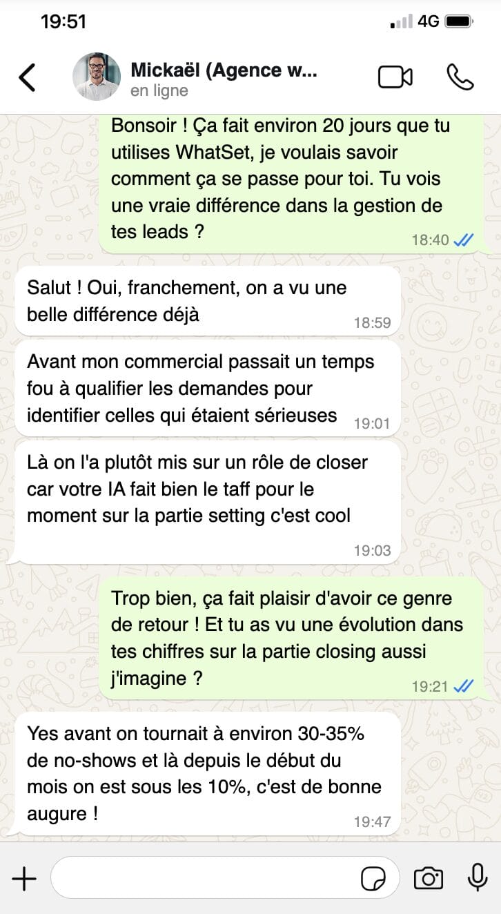Oui, WhatSet automatise la qualification des leads et la prise de rendez-vous, sans intervention humaine. Plus besoin d’un setter pour répondre aux messages, faire le tri et relancer : notre IA gère tout en temps réel et 24/7.